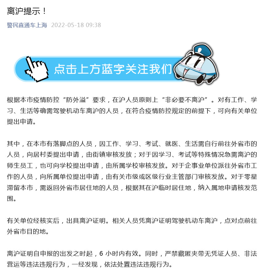 中新網(wǎng)5月18日電 據(jù)上海市公安局微信公眾號消息,根據(jù)上海市疫情防控“防外溢”要求,在滬人員原則上“非必要不離滬”。對有工作、學習、生活等確需駕駛機動車離滬的人員,在符合疫情防控規(guī)定的前提下,可向有關(guān)單位提出申請。有關(guān)單位經(jīng)核實后,出具離滬證明。相關(guān)人員憑離滬證明駕駛機動車離滬,點對點前往外省市目的地。離滬證明自申報的出發(fā)之時起,6 小時內(nèi)有效。同時,嚴禁藏匿夾帶無憑證人員、非法營運等違法違規(guī)行為,一經(jīng)發(fā)現(xiàn),依法處置違法違規(guī)行為。
