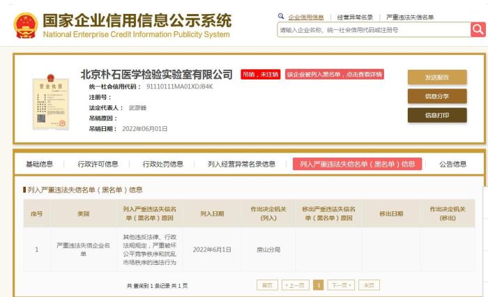 北京樸石醫(yī)學(xué)檢驗(yàn)實(shí)驗(yàn)室被列為嚴(yán)重違法失信企業(yè)