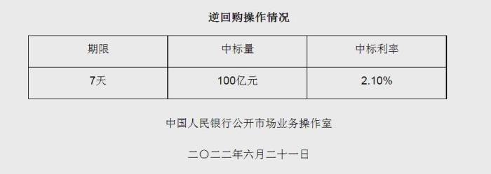 央行6月21日開展100億元逆回購(gòu)操作 中標(biāo)利率2.10%