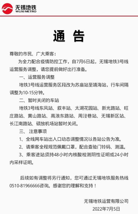中新網(wǎng)7月6日電 據(jù)江蘇無錫地鐵官方微博消息,為全力配合疫情防控工作,自7月6日起,無錫地鐵3號線運營服務(wù)調(diào)整。