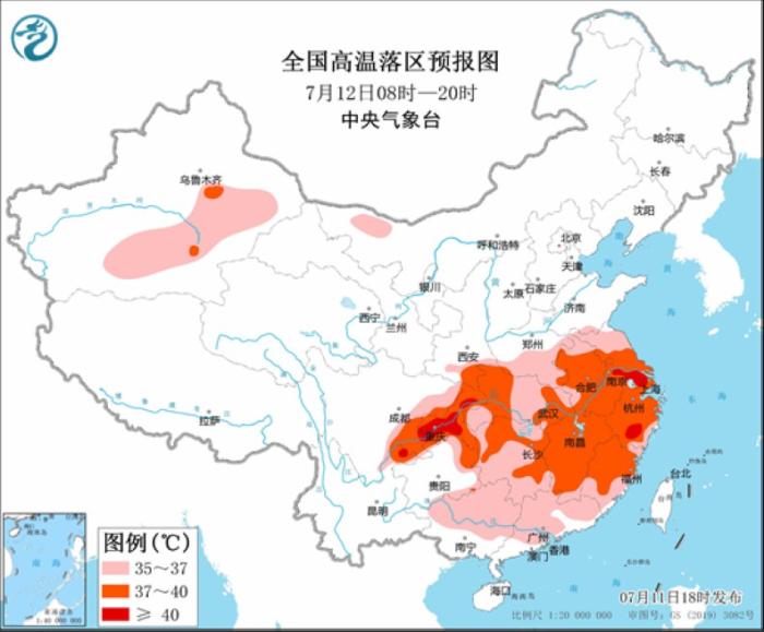 中央氣象臺7月12日06時繼續(xù)發(fā)布高溫橙色預(yù)警:預(yù)計7月12日白天,新疆南疆盆地、陜西南部、黃淮南部、西南地區(qū)東部、江漢、江淮、江南、華南等地有35℃以上高溫天氣,其中,安徽、江蘇中南部、上海、湖北西部和東南部、湖南北部和東部、江西、浙江、福建大部、四川盆地東南部、重慶、貴州東北部等地的部分地區(qū)最高氣溫37~39℃,江蘇南部、上海北部、浙江南部、四川盆地東南部、重慶中西部和北部局地可達(dá)40℃以上。