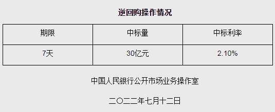 央行7月12日開展30億元逆回購操作 中標(biāo)利率2.10%