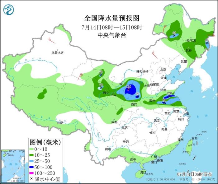 預計,7月14日08時至15日08時,西北地區(qū)東部、江蘇北部、安徽北部等地部分地區(qū)有大到暴雨,其中,甘肅東部、陜西北部等地局地有大暴雨(100~120毫米)。上述部分地區(qū)伴有短時強降水(最大小時降雨量20~50毫米,局地可超過60毫米),局地有雷暴大風等強對流天氣。中央氣象臺7月14日06時發(fā)布暴雨藍色預警。