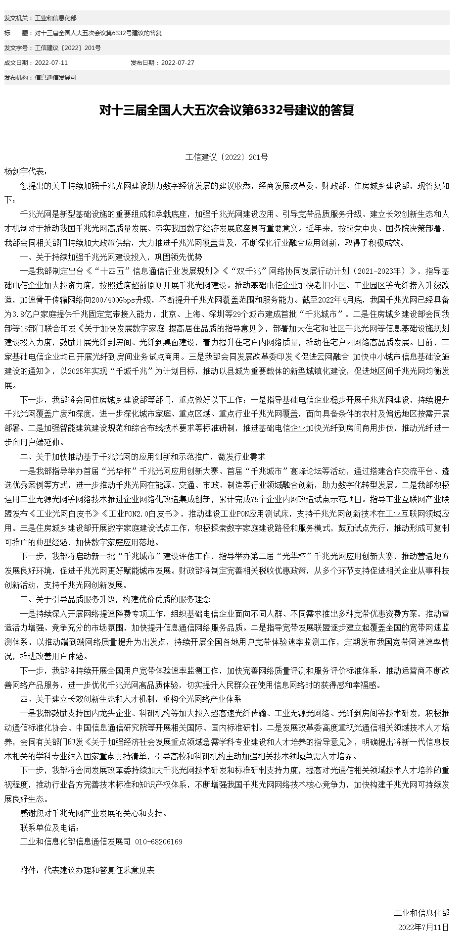 中新網(wǎng)7月27日電 工信部網(wǎng)站27日發(fā)布對(duì)十三屆全國(guó)人大五次會(huì)議第6332號(hào)建議的答復(fù)。工信部表示,將指導(dǎo)基礎(chǔ)電信企業(yè)穩(wěn)步開(kāi)展千兆光網(wǎng)建設(shè),持續(xù)提升千兆光網(wǎng)覆蓋廣度和深度,進(jìn)一步深化城市家庭、重點(diǎn)區(qū)域、重點(diǎn)行業(yè)千兆光網(wǎng)覆蓋,面向具備條件的農(nóng)村及偏遠(yuǎn)地區(qū)按需開(kāi)展部署。加強(qiáng)智能建筑建設(shè)規(guī)范和綜合布線技術(shù)要求等標(biāo)準(zhǔn)研制,推進(jìn)基礎(chǔ)電信企業(yè)加快光纖到房間商用步伐,推動(dòng)光纖進(jìn)一步向用戶(hù)端延伸。(中新財(cái)經(jīng))