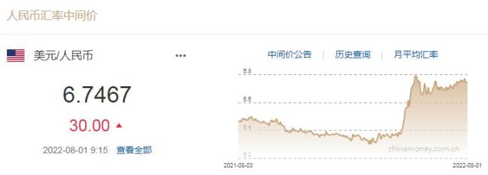 8月1日人民幣對(duì)美元中間價(jià)報(bào)6.7467元 下調(diào)30個(gè)基點(diǎn)