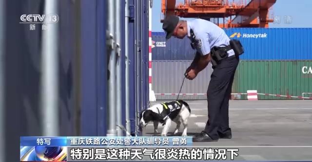 上午9點,戶外的氣溫已高達37℃。在重慶團結村中心站,一批集裝箱馬上要搭乘中歐班列出發(fā)。重慶鐵路公安處鐵警陳城帶著他的防爆犬“閃電”正在對這批貨進行最后的防爆檢驗。