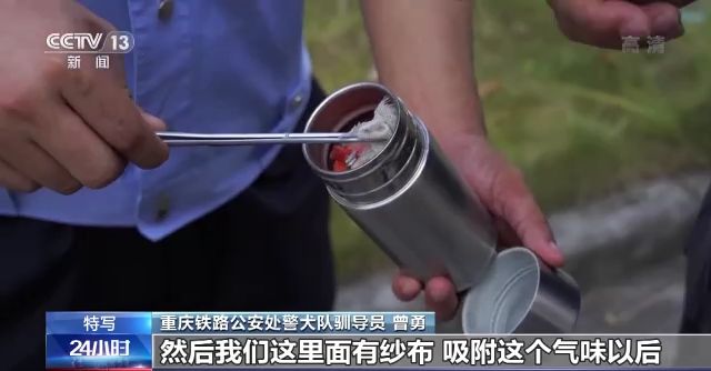 重慶鐵路公安處警犬隊馴導員 曾勇:這是我們訓練用的乳化炸藥,然后我們這里面有紗布,吸附這個氣味后,就可以放在箱子里面,然后讓搜爆犬來進行搜尋。如果它坐下或者臥下示警的話,就表示這個箱子里有危險品。