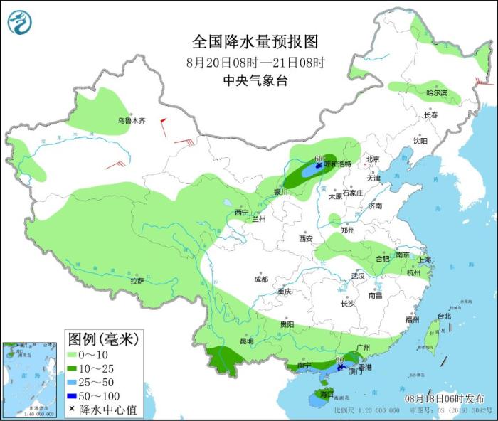 8月20日08時(shí)至21日08時(shí),內(nèi)蒙古西部、云南西南部、華南南部和海南島等地部分地區(qū)有中到大雨,其中,內(nèi)蒙古河套地區(qū)、廣東西南部沿海等地部分地區(qū)有暴雨(50~90毫米)。新疆南疆盆地部分地區(qū)有4~6級風(fēng),其中,新疆東部部分地區(qū)有7~8級風(fēng)。
