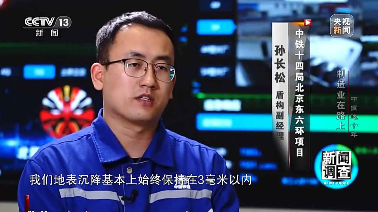 孫長(zhǎng)松 中鐵十四局北京東六環(huán)項(xiàng)目盾構(gòu)副經(jīng)理:我們盾構(gòu)機(jī)開(kāi)挖直徑是16米07,我們地表沉降基本上始終保持在3毫米以內(nèi)。