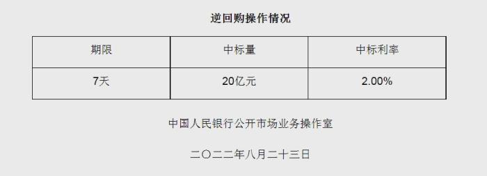 央行8月23日進(jìn)行20億元7天期逆回購(gòu)操作 中標(biāo)利率2.00%
