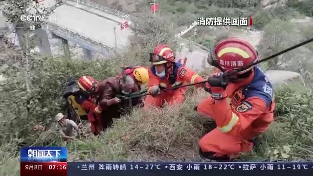 繩橋搭建完成后,消防員徒步跨過阻擋在道路中央的石塊,將小孩和病情危重的老人進(jìn)行轉(zhuǎn)移。