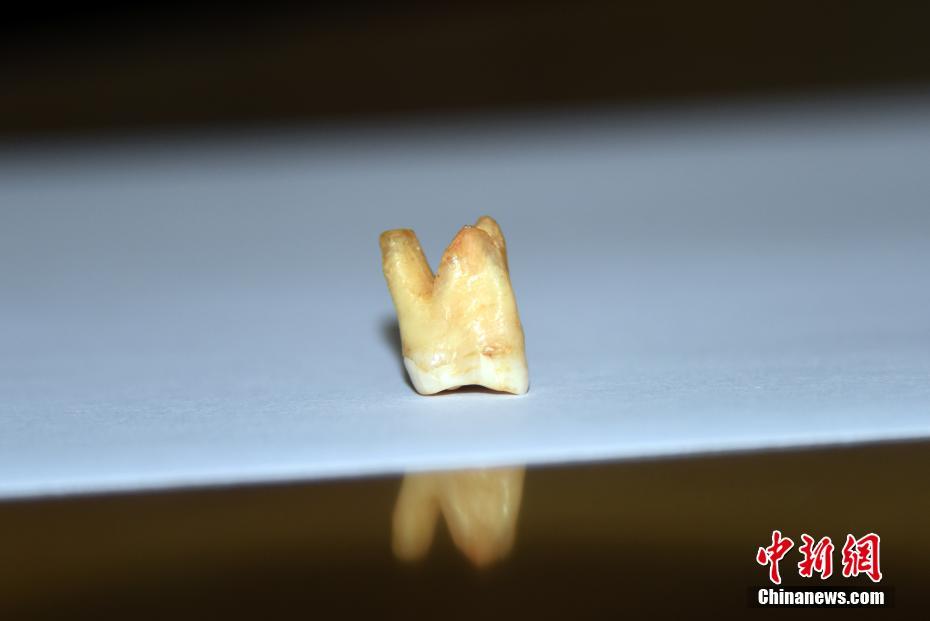 中國(guó)科學(xué)院古脊椎動(dòng)物與古人類研究所(中科院古脊椎所)青年研究員吳妍帶領(lǐng)的研究團(tuán)隊(duì),通過對(duì)湖南道縣福巖洞遺址出土的、迄今所知東亞最早現(xiàn)代人(8-12萬年前)的牙齒化石進(jìn)行牙結(jié)石提取與分析,最新研究發(fā)現(xiàn)東亞最早現(xiàn)代人植物類食物的直接證據(jù),并發(fā)現(xiàn)當(dāng)時(shí)的古人類就已經(jīng)有了剔牙行為。這項(xiàng)重要研究發(fā)現(xiàn)的成果論文,已在國(guó)際專業(yè)學(xué)術(shù)期刊《植物科學(xué)前沿》發(fā)表。圖為9月7日,北京,中科院古脊椎所標(biāo)本館,展示一顆用于本次研究的湖南道縣福巖洞遺址出土、8-12萬年前東亞最早現(xiàn)代人牙齒化石標(biāo)本。 中新社記者 孫自法 攝