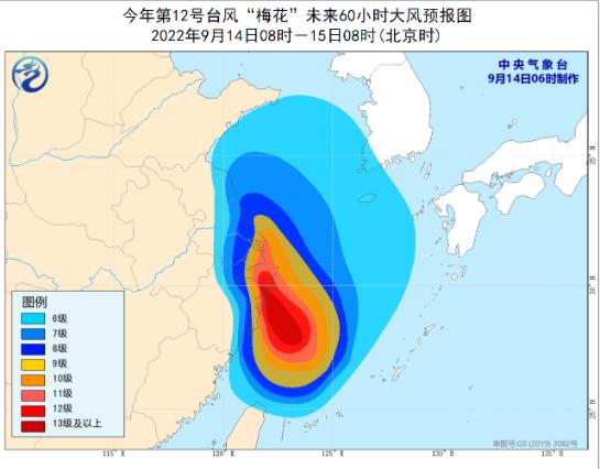 大風預報:9月14日08時至15日08時,東海大部及釣魚島附近海域、黃海中南部海域、長江口區(qū)、杭州灣以及臺灣島北部沿海、福建北部沿海、山東南部沿海、浙江東部、上海、江蘇東部沿海和地區(qū)將有6-8級大風,陣風9-11級,其中東海中西部海域、浙江中北部沿海、上海沿海、江蘇東南部沿海、杭州灣、長江口區(qū)將有9-11級大風,陣風12-14級,“梅花”中心經(jīng)過的附近海面或地區(qū)的風力有12-14級,陣風可達15-16級。