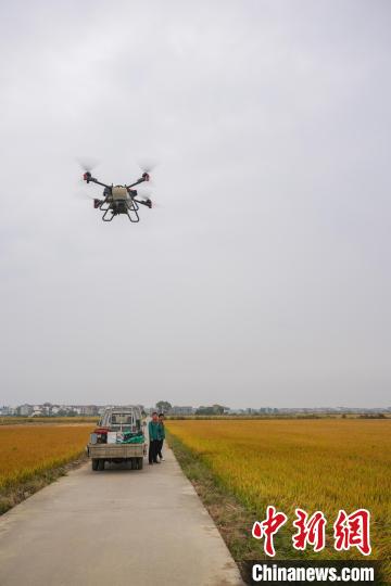 圖為南昌市安義縣農(nóng)戶使用無人機在稻田間進行油菜籽播種。 記者 華山 攝