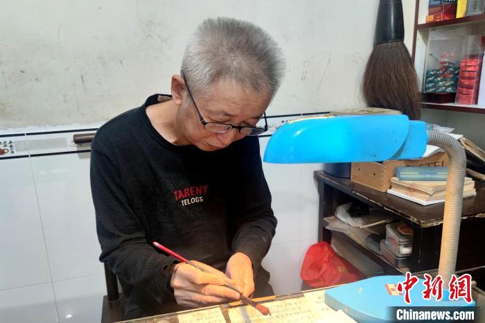 藍(lán)田張氏毛筆制作技藝非遺傳承人張才枝在為剛做好的毛筆刻字?!枪跇?biāo) 攝