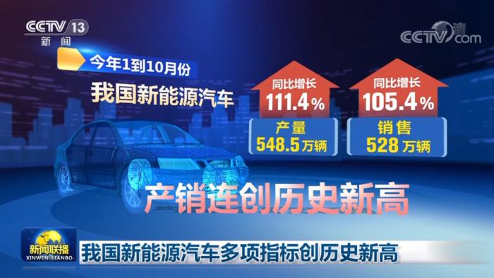 央視網(wǎng)消息(新聞聯(lián)播):今年前十個(gè)月,我國(guó)新能源汽車產(chǎn)銷量、出口量等多項(xiàng)指標(biāo)創(chuàng)歷史新高。