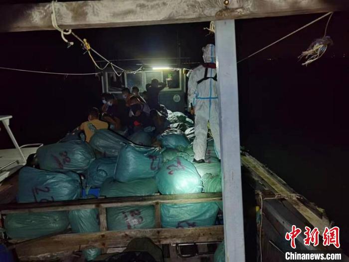 案發(fā)當(dāng)晚22時(shí)許,防城港海警局東興第一工作站執(zhí)法員在海域巡邏時(shí),發(fā)現(xiàn)一艘裝有大量袋裝貨物的漁船,形跡可疑。執(zhí)法員隨即向可疑船鳴笛、喊話(huà)亮明身份,要求其立即停船接受檢查,執(zhí)法員穿戴好防護(hù)裝具后,登臨對(duì)船上人員進(jìn)行控制。