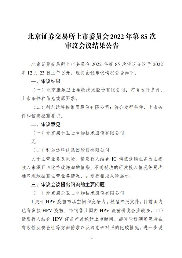 中新網12月26日電 北京證券交易所網站消息,北京證券交易所上市委員會2022年第85次審議會議于2022年12月23日上午召開。審議結果顯示,北京康樂衛(wèi)士生物技術股份有限公司、利爾達科技集團股份有限公司符合發(fā)行條件、上市條件和信息披露要求。