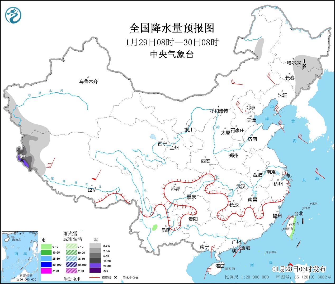1月28日08時(shí)至29日08時(shí),新疆西南部山區(qū)、內(nèi)蒙古東北部、黑龍江南部、吉林北部和東部、云南西北部、西藏東部等地的部分地區(qū)有小雪或雨夾雪,其中新疆西南部山區(qū)局地中雪或大雪(5~8毫米);西藏東南部、云南中部、臺(tái)灣島東部等地的部分地區(qū)有小雨。內(nèi)蒙古大部、華北北部、黑龍江東部、遼寧、山東半島、浙江、廣西東南部等地的部分地區(qū)有4~6級(jí)風(fēng),西藏中西部的部分地區(qū)風(fēng)力可達(dá)7級(jí)以上(見圖1)。渤海、渤海海峽、黃海大部海域、東海大部海域、臺(tái)灣海峽、南海大部海域、北部灣有6~8級(jí)、陣風(fēng)8~10級(jí)的大風(fēng),其中臺(tái)灣海峽、南海中東部和西南部的部分海域風(fēng)力可達(dá)9級(jí)、陣風(fēng)10~11級(jí)。