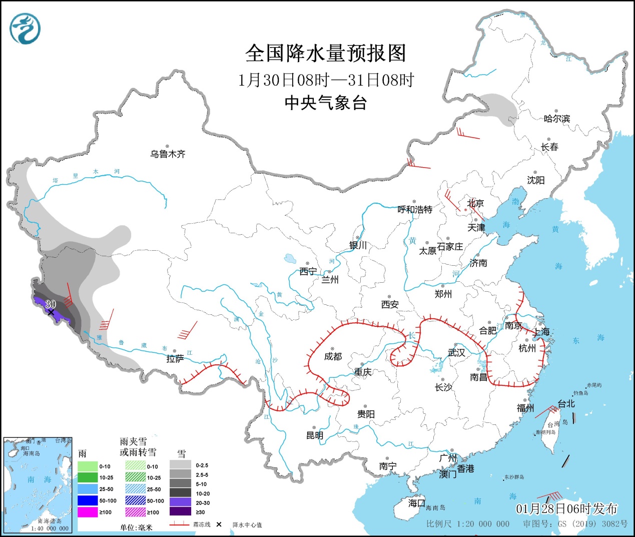 1月29日08時(shí)至30日08時(shí),新疆西南部山區(qū)、西藏西部、內(nèi)蒙古東北部、黑龍江東南部、吉林東部等地的部分地區(qū)有小到中雪,其中西藏西部的部分地區(qū)有大到暴雪,局地大暴雪(20~30毫米)。內(nèi)蒙古中東部、華北中北部、遼寧、山東半島、廣西東南部等地的部分地區(qū)有4~6級(jí)風(fēng),西藏中南部的部分地區(qū)風(fēng)力可達(dá)7級(jí)以上(見圖2)。渤海海峽、黃海東部、東海東北部、臺(tái)灣海峽、北部灣、南海大部海域有6~8級(jí)、陣風(fēng)8~10級(jí)的大風(fēng),其中南海西南部的部分海域風(fēng)力可達(dá)9級(jí)、陣風(fēng)10~11級(jí)。