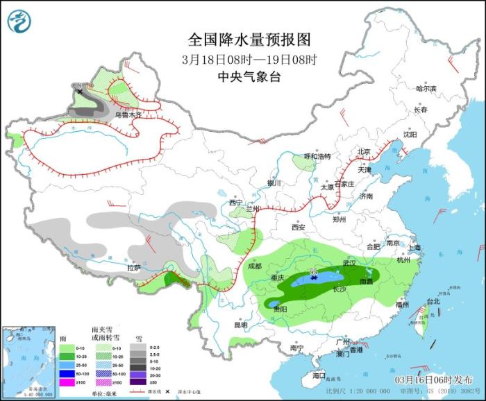 3月18日08時(shí)至19日08時(shí),新疆沿天山地區(qū)和西北部、西藏東部和南部、青海中部和南部等地部分地區(qū)有小到中雪或雨夾雪,其中,新疆沿天山地區(qū)等地局地有大雪(5~8毫米)。西藏東南部、貴州中部和東北部、重慶東南部、湖南中北部、湖北東南部、江西北部等地部分地區(qū)有中到大雨,局地暴雨(50~55毫米)。內(nèi)蒙古中部、黑龍江東北部、新疆北部、西藏中部等地部分地區(qū)有4~6級(jí)風(fēng)。臺(tái)灣海峽將有6~7級(jí)、陣風(fēng)8級(jí)的東北風(fēng)。