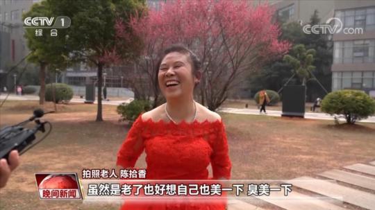 拍照老人 陳拾香:我們以前是農村的,做夢也沒想到穿婚紗照相的。我這是第一次(穿婚紗),我今天可是特別開心。雖然是老了,也好想自己也美一下。