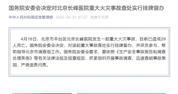 國務(wù)院安委會決定對北京長峰醫(yī)院重大火災(zāi)事故查處實行掛牌督辦