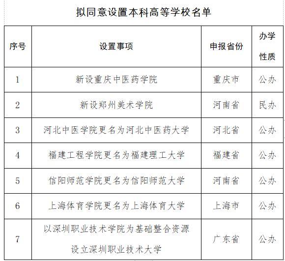 教育部公示7所擬同意設置本科高等學校名單