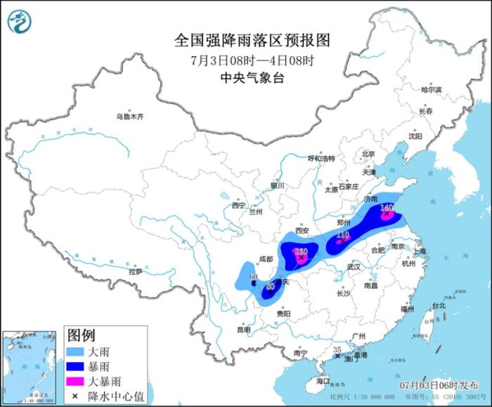 7月3日08時(shí)至4日08時(shí),山東中南部、江蘇北部、安徽北部、河南東部和南部、湖北北部和西部、陜西南部、重慶、四川東部、貴州西北部、云南東北部以及廣東西南部沿海等地部分地區(qū)有大到暴雨,其中,山東南部、江蘇北部、河南南部、重慶北部、四川東北部等地局地有大暴雨(100~160毫米)。內(nèi)蒙古中西部、甘肅中北部、青海北部等地部分地區(qū)有4~6級(jí)風(fēng)。