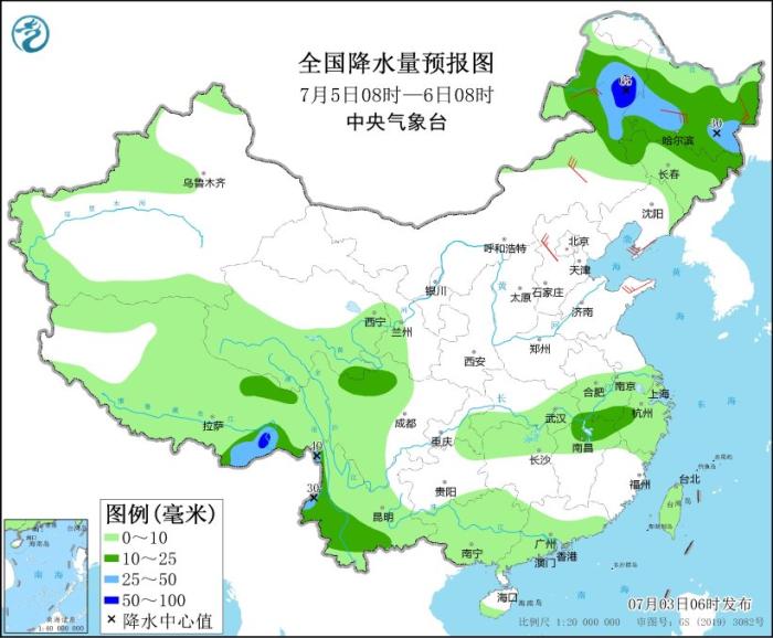 7月4日08時(shí)至5日08時(shí),內(nèi)蒙古東部、黑龍江南部、吉林、遼寧以及蘇皖南部、湖北西南部、湖南北部、廣東南部、廣西北部和西部、云南大部、西藏東南部等地部分地區(qū)有中到大雨,其中,內(nèi)蒙古東北部、黑龍江西南部、吉林中西部、遼寧中東部、西藏東南部等地部分地區(qū)有暴雨或大暴雨(100~120毫米)。內(nèi)蒙古、華北北部和西部、黃淮東部、東北地區(qū)南部等地部分地區(qū)有4~6級(jí)風(fēng)。