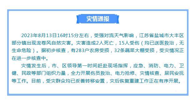 中新網(wǎng)8月13日電 據(jù)江蘇鹽城大豐區(qū)委區(qū)政府官方微信消息,8月13日16時15分左右,受強對流天氣影響,江蘇省鹽城市大豐區(qū)部分鎮(zhèn)出現(xiàn)龍卷風自然災害。災害造成2人死亡,15人受傷(均已送醫(yī)救治,無生命危險)。據(jù)初步核查,有283戶農(nóng)房受損,32條蔬菜大棚受損,受災情況正在進一步核查中。