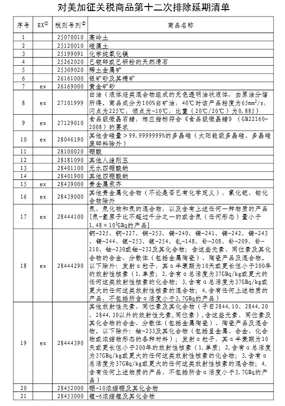 國務(wù)院關(guān)稅稅則委員會(huì)公布對(duì)美加征關(guān)稅商品第十二次排除延期清單