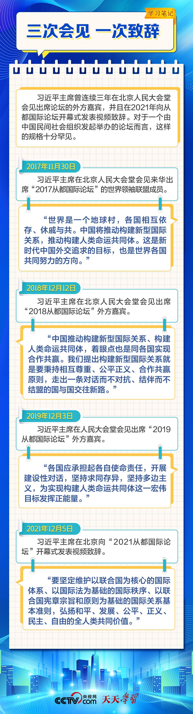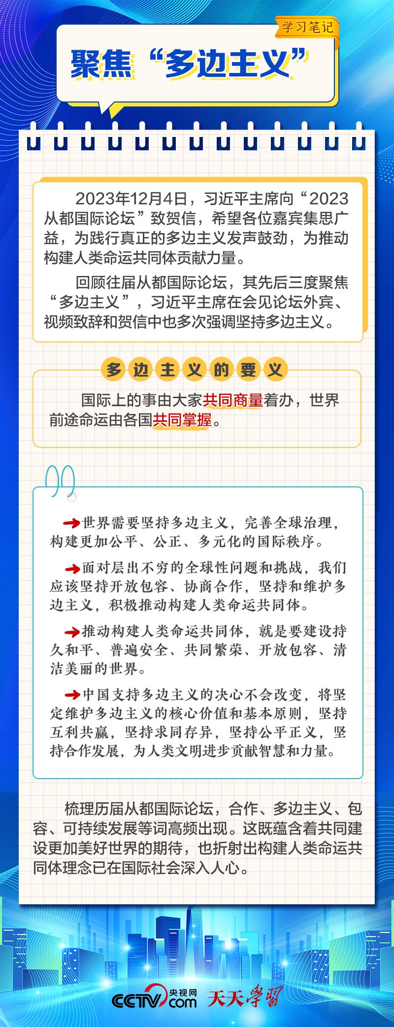 天天學(xué)習(xí) 12月4日,習(xí)近平主席在致“2023從都國際論壇”的賀信中強調(diào),面對前所未有的世界之變、時代之變和歷史之變,人類社會必須團結(jié)起來,堅持互學(xué)互鑒、開放包容、合作共贏,弘揚全人類共同價值,共同建設(shè)更加美好的世界。