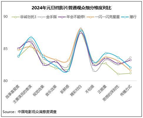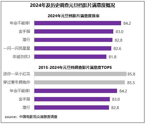 中國(guó)電影觀(guān)眾滿(mǎn)意度調(diào)查 2024年元旦檔調(diào)查結(jié)果顯示,元旦檔電影觀(guān)眾滿(mǎn)意度得分83.0分,環(huán)比增長(zhǎng)0.2分。檔期以多元化且高契合度的影片供給陪伴觀(guān)眾跨年,得到了較高的滿(mǎn)意度評(píng)價(jià),5部影片中有4部進(jìn)入歷史調(diào)查19部元旦檔影片的滿(mǎn)意度前十,喜劇《年會(huì)不能停!》以84.2分領(lǐng)銜,《金手指》83.0分居第二位,《潛行》《一閃一閃亮星星》均超82分,《非誠(chéng)勿擾3》超81分。