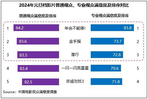 2024年元旦檔調(diào)查的5部影片中,單片滿(mǎn)意度前三的影片在普通觀(guān)眾和專(zhuān)業(yè)觀(guān)眾評(píng)價(jià)中的排序保持一致,而居單片滿(mǎn)意度后兩位的影片排序則有所差異,展現(xiàn)出不同細(xì)分觀(guān)眾群體的觀(guān)影審美差異。