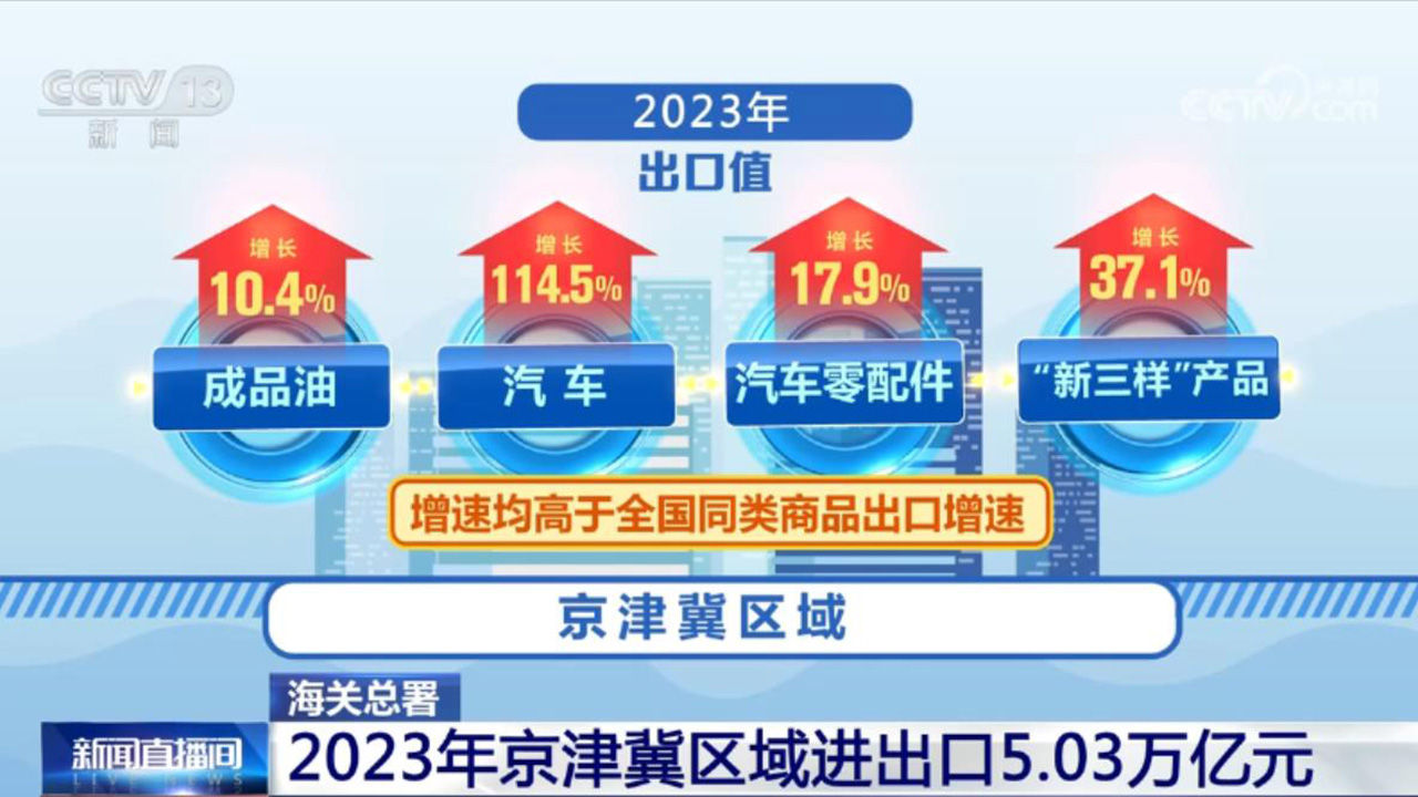 在出口方面,2023年京津冀區(qū)域出口1.31萬億元,增長2.5%,占全國出口總值的5.5%,其中,成品油、汽車、汽車零配件、“新三樣”產(chǎn)品的出口值分別增長10.4%、114.5%、17.9%、37.1%,增速均高于全國同類商品出口增速。