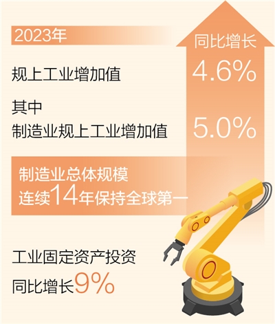 本報(bào)北京1月21日電 (記者王政、劉溫馨)記者日前從工業(yè)和信息化部獲悉:2023年,全年規(guī)模以上工業(yè)增加值同比增長(zhǎng)4.6%,較2022年提升1個(gè)百分點(diǎn),其中制造業(yè)規(guī)模以上工業(yè)增加值同比增長(zhǎng)5.0%,我國(guó)制造業(yè)總體規(guī)模連續(xù)14年保持全球第一。