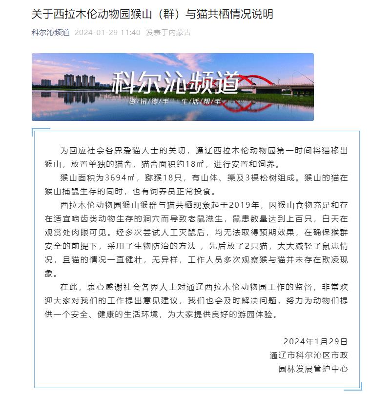 中新網(wǎng)1月29日電 據(jù)內蒙古通遼市科爾沁區(qū)融媒體中心微信公眾號消息,通遼市科爾沁區(qū)市政園林發(fā)展管護中心29日發(fā)布《關于西拉木倫動物園猴山(群)與貓共棲情況說明》(下稱“情況說明”)。情況說明顯示,通遼西拉木倫動物園已第一時間將貓移出猴山,且貓的情況一直健壯,無異樣,工作人員多次觀察猴與貓并未存在欺凌現(xiàn)象。全文如下: