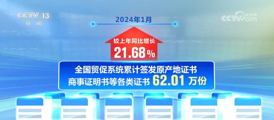2024年1月,全國貿(mào)促系統(tǒng)累計簽發(fā)原產(chǎn)地證書、商事證明書等各類證書62.01萬份,較上年同比增長21.68%。其中,全國貿(mào)促系統(tǒng)非優(yōu)惠原產(chǎn)地證書簽證金額為325.48億美元,同比增長9.12%;簽證份數(shù)38.24萬份,同比增長14.36%。
