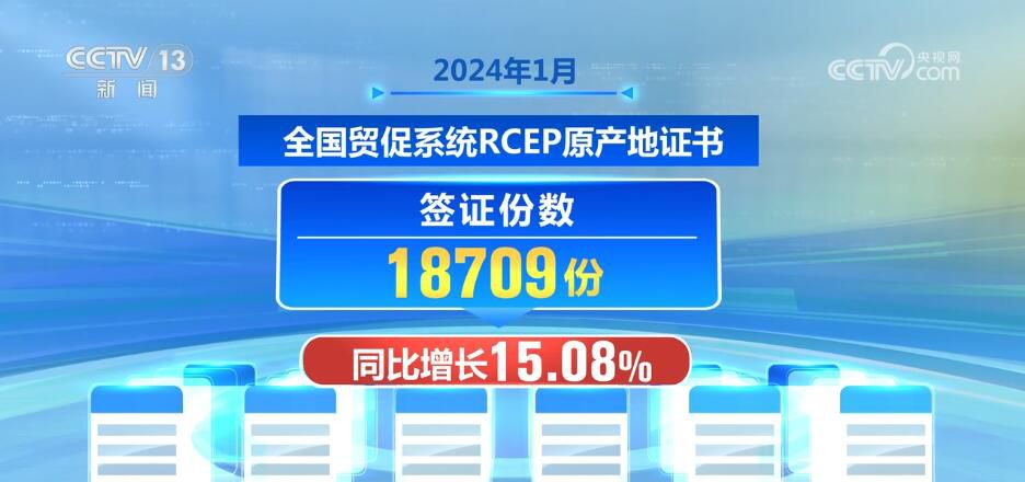 2024年1月,全國貿(mào)促系統(tǒng)RCEP原產(chǎn)地證書簽證份數(shù)為18709份,同比增長15.08%;辦證企業(yè)3640家,同比增長10.40%,出口目的國包括日本、印尼、韓國、越南等13個成員國,預(yù)計共為我國產(chǎn)品在RCEP進(jìn)口成員國減免關(guān)稅0.09億美元,RCEP的政策紅利在持續(xù)釋放。