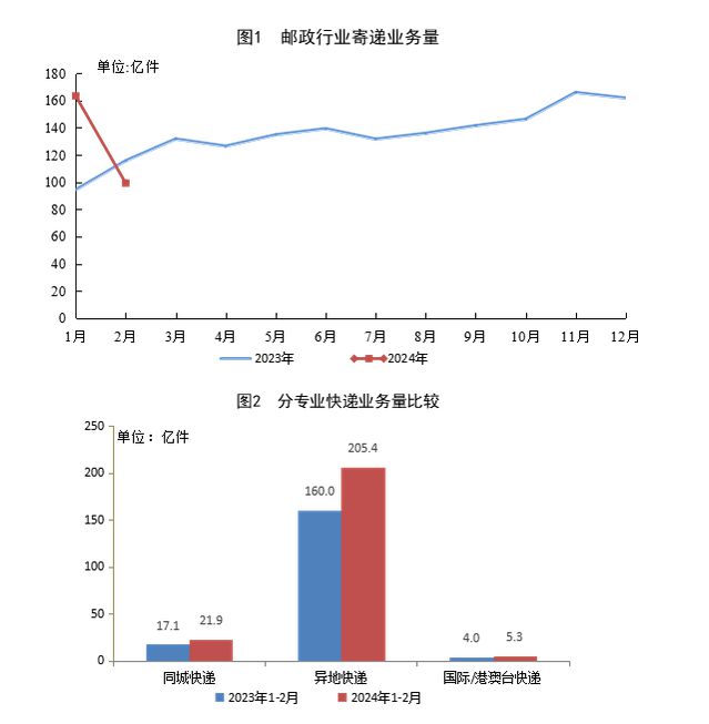 1-2月,同城快遞業(yè)務(wù)量完成21.9億件,同比增長(zhǎng)28.3%;異地快遞業(yè)務(wù)量完成205.4億件,同比增長(zhǎng)28.5%;國(guó)際/港澳臺(tái)快遞業(yè)務(wù)量完成5.3億件,同比增長(zhǎng)31.9%。