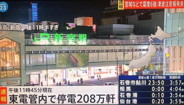 3月16日日本福島縣海域發(fā)生7.4級地震,導(dǎo)致大規(guī)模停電。圖片來源:日本電視臺報(bào)道截圖