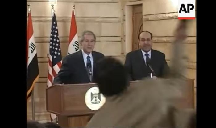 2008年12月,時任美國總統(tǒng)小布什在伊拉克首都巴格達(dá)的新聞發(fā)布會上,被伊拉克記者蒙塔達(dá)爾·扎伊迪扔鞋。圖片來源:路透社視頻截圖