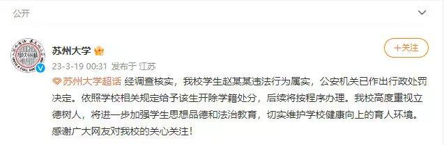 3月19日,蘇州大學(xué)發(fā)布通報:經(jīng)調(diào)查核實,我校學(xué)生趙某某違法行為屬實,公安機關(guān)已作出行政處罰決定。依照學(xué)校相關(guān)規(guī)定給予該生開除學(xué)籍處分,后續(xù)將按程序辦理。我校高度重視立德樹人,將進一步加強學(xué)生思想品德和法治教育,切實維護學(xué)校健康向上的育人環(huán)境。感謝廣大網(wǎng)友對我校的關(guān)心關(guān)注!