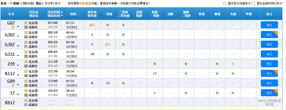 以北京開(kāi)往上海、杭州、成都等方向的列車(chē)為例,3月31日、4月1日車(chē)次多數(shù)余票充足,僅個(gè)別車(chē)次需要候補(bǔ)購(gòu)票。