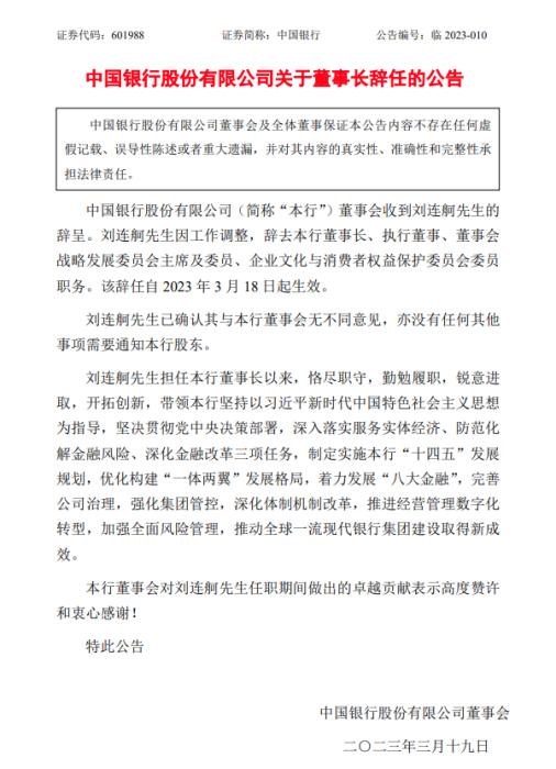 另外,19日,中國銀行公告稱,劉連舸因工作調(diào)整,辭去董事長、執(zhí)行董事、董事會戰(zhàn)略發(fā)展委員會主席及委員、企業(yè)文化與消費者權(quán)益保護委員會委員職務(wù)。