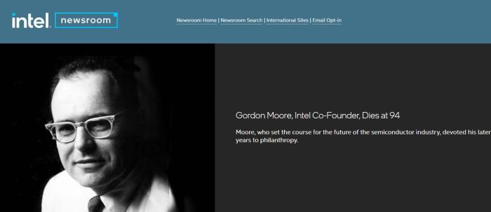 英特爾官網發(fā)布的戈登·摩爾去世的消息。圖片來源:英特爾官網截圖