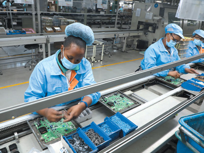當(dāng)?shù)貑T工在海信南非工業(yè)園的零配件生產(chǎn)車(chē)間裝配電機(jī)。
