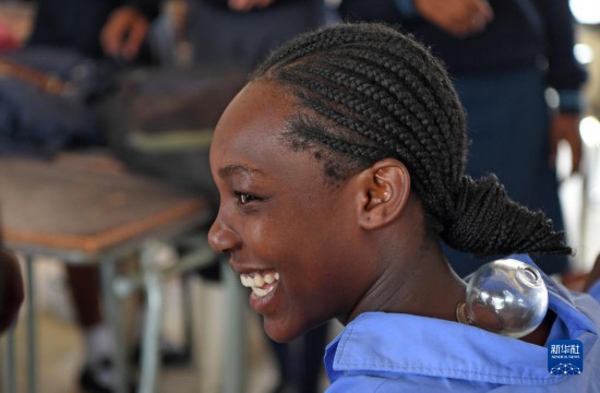 4月3日,在納米比亞溫得和克的伊曼紐爾·謝菲迪中學(xué)課堂上,一名學(xué)生體驗(yàn)推拿。新華社發(fā)(穆薩·卡薩克攝)