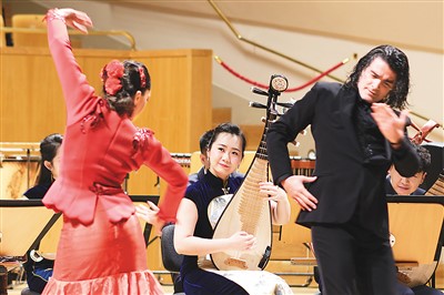 音樂(lè)會(huì)在一曲熱烈歡快的《春節(jié)序曲》中拉開(kāi)序幕。兩國(guó)樂(lè)團(tuán)合奏的新創(chuàng)曲目《陽(yáng)光永遠(yuǎn)照耀著我們的友誼》融合了中西音樂(lè)特色,令觀眾耳目一新;京劇《貴妃醉酒》向西班牙觀眾展現(xiàn)了中國(guó)傳統(tǒng)戲曲文化的獨(dú)特風(fēng)采;西班牙歌唱家用中文和西文演唱《我愛(ài)你中國(guó)》,以歌聲傳遞了兩國(guó)民眾間的友好情誼;中國(guó)樂(lè)器笙演奏的《西班牙斗牛曲》“混搭”西班牙“國(guó)粹”弗拉門戈舞蹈,更是令人擊節(jié)叫好。兩國(guó)藝術(shù)家以樂(lè)會(huì)友、以藝通心,通過(guò)中西音樂(lè)元素的碰撞與交融,展現(xiàn)了東西方文化的互融互鑒。